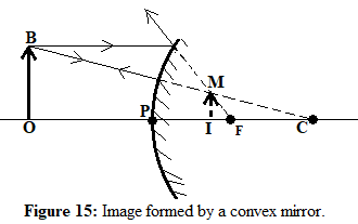 As could be seen from Figure 15, the image formed by a convex mirror is always upright, diminished and virtual, no matter what position the object is, in front of the convex mirror, the image always have the stated properties.