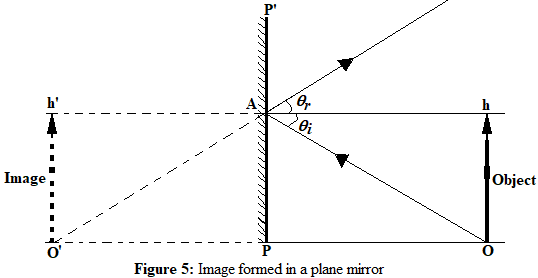 Using the laws of reflection, the image formed by a plane mirror could be illustrated as in Figure 5, where it could be seen that the image formed has the following properties: