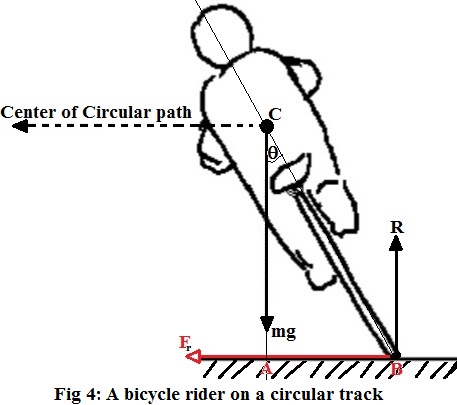 $${F_{r}\cdot AC = R\cdot AB}$$ If AC = h and AB = a and also knowing that R = mg, then $${F_{r}\cdot h = mg\cdot a}$$ $${\frac{a}{h} = \frac{F_{r}}{mg}}$$ But if we consider ΔABC, then, we can clearly see that $${tan~\theta = \frac{a}{h}}$$ hence, $${tan~\theta = \frac{F_{r}}{mg}~~~~----------------1a}$$ Now, from the previous study, it is clear that Fr is the centripetal force maintaining the bicycle in the circular track, that is, $${F_{r} = \frac{mv^{2}}{r}~~~~-----------------2a}$$ where v, is the linear velocity of the bicycle around the circular track while r, is the radius of the circular track. If we now substitute Eq.2a into Eq.1a, then we have $${tan~\theta = \frac{v^{2}}{rg}~~~~-----------------3a}$$ It should be noted that when Fr is greater than the limiting friction then skidding occurs. In this case F > μmg or mg tan θ > μmg. Thus tan θ > μ is the condition for skidding.