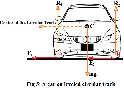 Consider a car, as shown in Figure 5 above, moving on a leveled ground but on a circular track (or road), if there is no skidding and the car is in equilibrium as it moves round the circular track, then