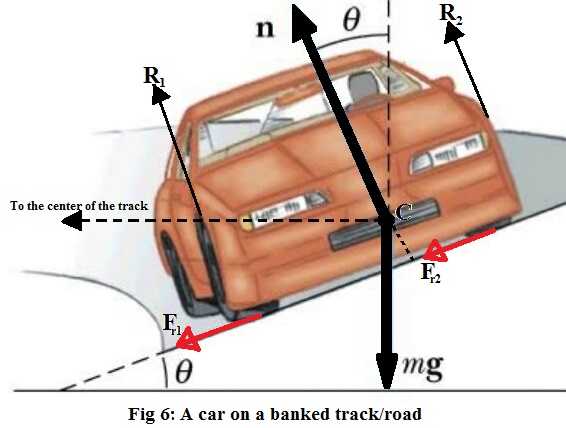 If we now solve Eqs 4a, 5a and 6a for R1 and R2, then we have $${R_{1}= \frac{1}{2}m\left(g-\frac{v^{2}h}{ra}\right) ~~~~---------------7a}$$ and $${R_{2}= \frac{1}{2}m\left(g+\frac{v^{2}h}{ra}\right) ~~~~---------------8a}$$ From Eq. 7a, it is possible that $${g = \frac{v^{2}h}{ra},}$$ if this happens then, R1 = 0 and R2 = mg with the result that the car then spins about its center of gravity C, in an anticlockwise direction towards the center of the circular path. In order to maintain stability the above car will need to bend, like the bicycle in Application 1. Unfortunately, this is not possible for a vehicle on four wheels . Instead of bending the car the road/track itself could be sloped around the curve. This sloping is called "banking" and the sloping angle is called "banking angle".