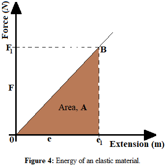 $${Area,~ A=\frac{1}{2}\times base\times height}$$ $${~~~~~~~~=\frac{1}{2}\times 0e_{1}\times 0F_{1}}$$ $${=\frac{1}{2}Fe}$$ This area A, is defined as the work done by the force F in extending a material be an extension e, that is, $${Work, ~W=\frac{1}{2}Fe.}$$ The work done W, is the energy stored in the material as it is kept under the extension F, if F is given in the unit of Newton(N) and the extension in the unit of metre (m) then the work done W is in the unit of Joule (J). Previously, we saw that F could be given in terms of the Young's modulus E as, $${F=\frac{EAe}{l}}$$ hence, $${W=\frac{1}{2}\frac{EAe^{2}}{l}.}$$ If we know the original length of the material, then we can find its volume as $${Volume =Cross-section ~area \times Original ~length}$$ $${~~~~~~~=A \times l}$$ We can now calculate the energy per unit volume as $${Energy~per~unit~volume=\frac{W}{Al}}$$ $${=\frac{1}{2}Fe\div Al}$$ $${=\frac{1}{2}\frac{F}{A}\times \frac{e}{l}}$$ but $${Tensile ~Stress=\frac{F}{A}}$$ and $${Tensile ~Strain=\frac{e}{l}}$$ hence, $${Energy~per~unit~volume=\frac{1}{2}\times Tensile ~Stress \times Tensile ~Strain.}$$