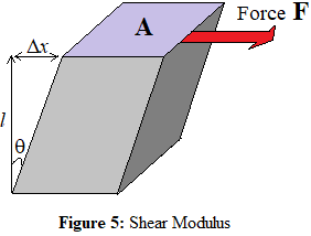 $${shear ~modulus=\frac{shear ~stress}{shear ~strain}}$$ $${G=\frac{\tau_{xy}}{\gamma_{x}}=\frac{F/A}{\Delta x/l}}$$ $${=\frac{Fl}{A\Delta x}}$$ Δx is the transverse displacement