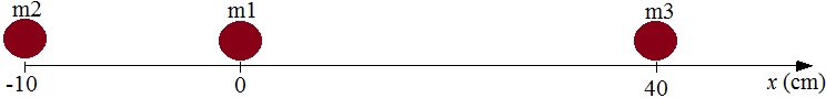 Now, m2's pull on m1 F2on1, is given by $${\bar{F}_{2on1}=-G\frac{m_{1}m_{2}}{r^{2}} }$$ The negative sign indicates that the force pulls to the left (i.e., it indicates the direction), therefore, substituting the given values, also remember to change centimeter to meter! $${\bar{F}_{2on1}=-6.673\times10^{-11}\frac{500\times500}{(10\times10^{-2})^{2}}, }$$ that is, $${\bar{F}_{2on1}=-1.68\times10^{-3}~N }$$ Also $${\bar{F}_{3on1}=-6.673\times10^{-11}\frac{500\times500}{(40\times10^{-2})^{2}}, }$$ that is, $${\bar{F}_{3on1}=1.04\times10^{-4}~N }$$ Now, the total force on m3 will be given as $${\bar{F}_{T}=\bar{F}_{3on1} + \bar{F}_{2on1} }$$, that is, $${\bar{F}_{T}=1.04\times10^{-4} - 1.68\times10^{-3}, }$$ $${=- 1.58\times10^{-3}~N. }$$ The result shows that the resultant pull on m1 is to the left!